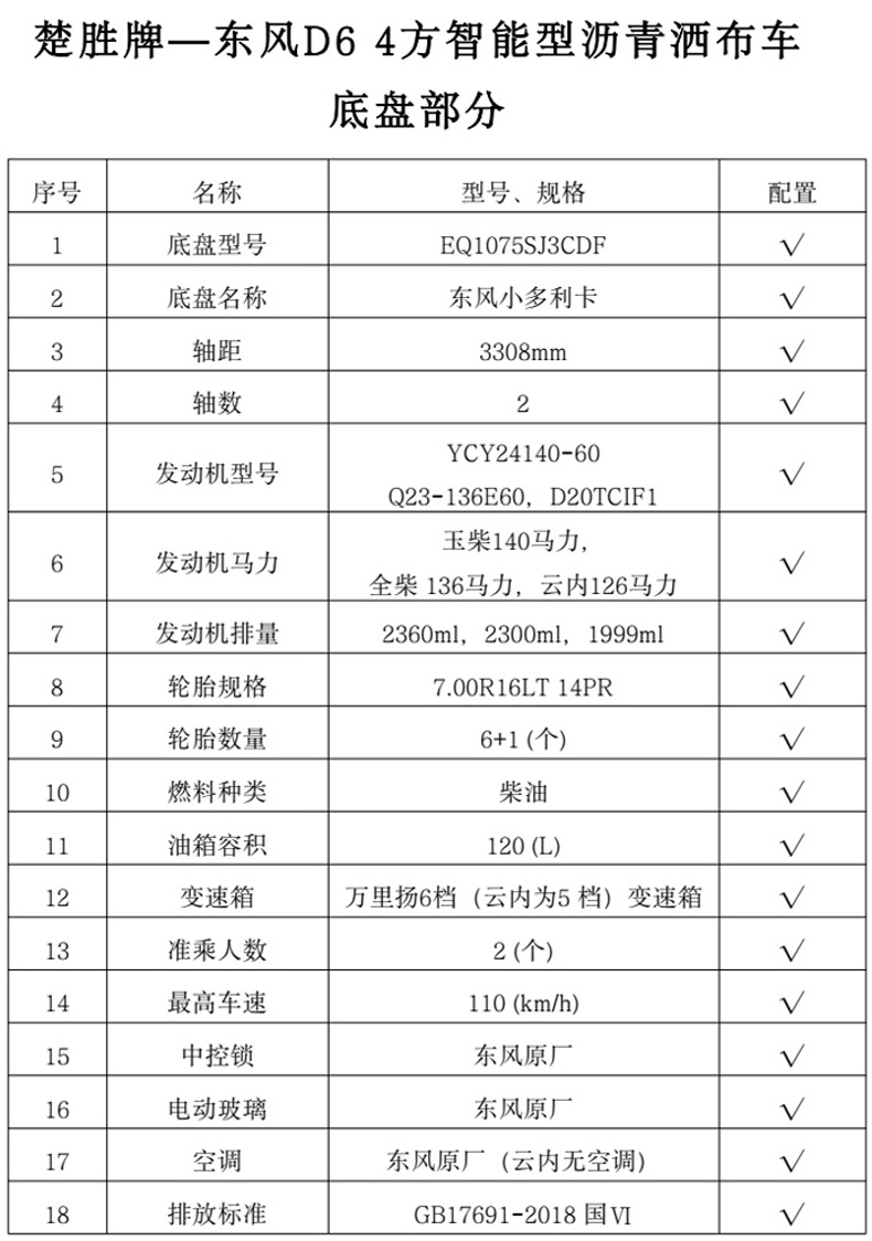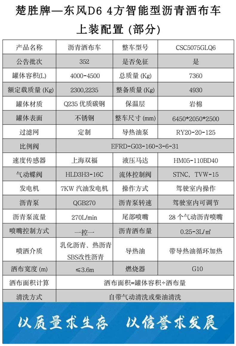 > 產(chǎn)品中心 > 瀝青灑布車 瀝青灑布車_東風(fēng)D6智能型4方灑布車★13908669111★楚勝牌CSC5075GLQ6瀝青灑布車,采用東風(fēng)EQ1075SJ3CDF底盤改裝而成,罐體材質(zhì)為優(yōu)質(zhì)碳鋼板,巖板保溫層,罐體表面不銹鋼材質(zhì),該灑布車由汽車底盤、瀝青 罐體、瀝青泵送及噴灑系統(tǒng)、液壓系統(tǒng)、燃燒及導(dǎo)熱油加熱系統(tǒng)、控制系統(tǒng)、氣動系統(tǒng)、操作平臺構(gòu)成。該車操作簡便,用于修筑高等級公路瀝青路面底層的透層油、防水層、粘結(jié)層的灑布。更多瀝青灑布車盡在:m.jinshengjie.cn