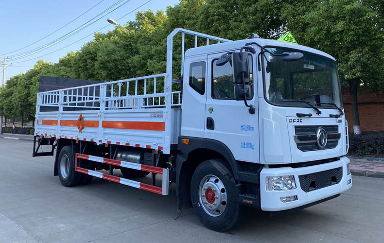 該車為危險(xiǎn)貨物運(yùn)輸車.運(yùn)輸獨(dú)立容器(瓶)包裝的貨物;危險(xiǎn)貨物類項(xiàng)號(hào):2.1,2.2.側(cè),后防護(hù)材料均為Q235,側(cè)防護(hù)螺栓連接;后防護(hù)焊接,截面尺寸120×50mm,下邊緣離地高490mm.選裝后部無(wú)尾板,選裝后部無(wú)尾板時(shí),后防護(hù)焊接,截面尺寸120×60mm,下邊緣離地高490mm.選裝欄板樣式,選裝柵欄樣式.僅選用排氣管前置,安裝限速裝置(限速80km/h),前輪盤式制動(dòng)及子午線輪胎的底盤.后軸采用空氣懸架.轉(zhuǎn)向輪安裝輪胎爆胎應(yīng)急防護(hù)裝置,該車可選裝直接供電式ETC車載裝置.安裝帶有衛(wèi)星定位功能的行駛記錄儀.隨底盤選裝電瓶,尿素罐,儲(chǔ)氣筒安裝位置.EBS系統(tǒng)生產(chǎn)廠家,型號(hào):襄陽(yáng)東風(fēng)隆誠(chéng)機(jī)械有限責(zé)任公司,EBS/ESC-d.發(fā)動(dòng)機(jī)與油耗值(L/100Km)對(duì)應(yīng)關(guān)系為:B6.2NS6B230/26.7,D4.5NS6B220/26.6,YCS04200-68/26.4,CY4SK761/26.8.液壓升降尾板收起狀態(tài)水平長(zhǎng)度為290mm,尾板質(zhì)量為550kg.僅采用底盤4700mm,5300mm軸距改裝.隨底盤選裝駕駛室,選裝前組合燈具,前面罩和后視鏡.