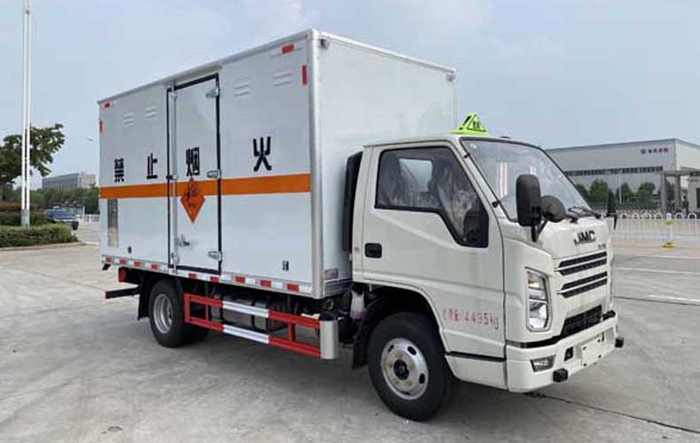1、該車適用于運輸危險品。廂體頂部封閉,不可開啟。危險貨物運輸車輛類型:EX/Ⅲ.該車用于運輸具有獨立容器(瓶)包裝的爆炸品。類項號:1.1B,1.1C,1.1D,1.1G,1.2C,1.2D,1.2G,1.3C,1.3G,1.4C,1.4D,1.4G。2、側,后防護材料均為Q235,側防護螺栓連接;后防護焊接,截面尺寸100×50mm,下邊緣離地高400mm。3、隨底盤選裝排半駕駛室,選裝前臉、前保險杠、前部燈具。安裝帶有衛星定位功能的行駛記錄。僅選用排氣管前置、限速裝置(限速80km/h)、前輪盤式制動及子午線輪胎的底盤。ABS系統型號:APG3550500A,ABS系統生產廠家:浙江亞太機電股份有限公司.發動機與油耗值對應關系為(L/100km):JX493ZLQ6D/10.75.轉向輪安裝輪胎防爆應急防護裝置.該車型可選裝ETC車載裝置.廂體側面選裝開門型式及位置,選裝不帶側開門;廂體側面板選裝開百葉窗。整備質量包括備胎、滅火器、隨車工具、停車楔;貨廂重量:1215kg;材質/厚度:底板材質為Q235,厚度3mm,側板為外冷扎鋼板+中間阻燃泡沫+內純鋁板,厚度42mm。選裝電瓶、尿素罐、儲氣筒左右安裝位置。