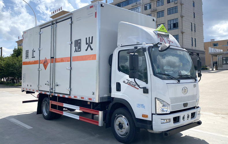 1、該車適用于運輸危險品,運輸具有獨立容器(瓶)包裝的物品,危險貨物運輸車輛類型:EX/Ⅲ,危險貨物類項號:1.1B,1.1G,1.3C,1.1D,1.2D,1.1C,1.4G.廂體頂部封閉,不可開啟.2、側,后防護材料均為Q235,側防護螺栓連接;后防護焊接,截面尺寸(mm)100×50,下邊緣離地高410mm.僅采用軸距3900mm.3、僅選用排氣管前置、限速裝置(限速80km/h)、前輪盤式制動及子午線輪胎的底盤,轉向輪安裝輪胎防爆應急防護裝置.安裝帶有衛星定位功能的行駛記錄儀.ABS/型號生產廠家:CM4XL-4S/4M/廣州瑞立科密汽車電子股份有限公司,VIE ABS-II/浙江萬安科技股份有限公司.發動機/油耗值(L/100km)對應關系為:WP3NQ160E61/20.85,D30TCIF1/21.03,CA4DD1-16E6/21.18,CA4DD2-18E6/20.63.4、隨底盤選裝排半駕駛室,選裝改側窗的駕駛室,選裝新前臉駕駛室,選裝不同的側門結構,選裝新結構的保險杠,選裝新的翼子板結構,選裝不帶導流罩.該車可選裝直接供電式ETC.廂體側面選裝不同形式側開門及開門位置或不帶側門,選裝后門雙拉桿.