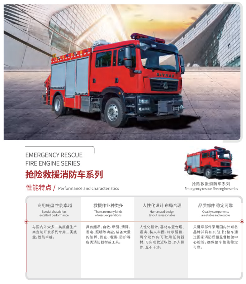 具有起吊、自救、牽引、清障、發電、照明等功能,裝備大量的破拆、偵查、堵漏、防護等各類消防器材或工具。